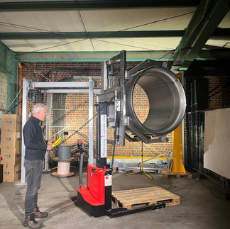 Die Herausforderung: Große, runde Schalldämpfer mit einem Gewicht von 650 Kilogramm sollen in der Produktion aufgenommen, bewegt und exakt positioniert werden. Eine manuelle Handhabung ist nicht nur schwierig und unpraktisch, sondern auch ergonomisch problematisch.